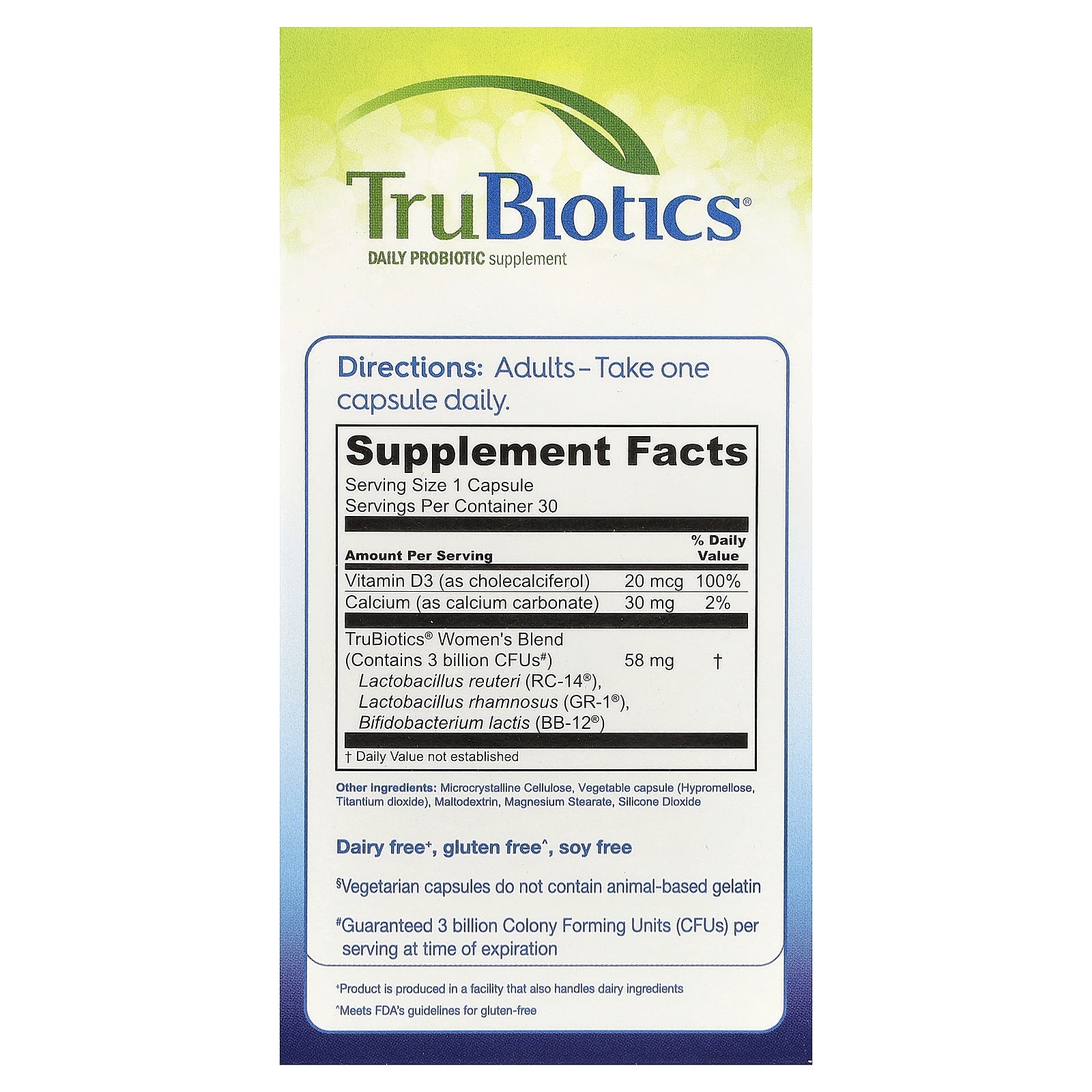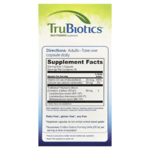 TruBiotics Women’s é um probiótico diário completo para mulheres especialmente formulado com cálcio e vitamina D. Esta fórmula exclusiva possui as estirpes probióticas mais clinicamente pesquisadas para manter o pH vaginal e a levedura em equilíbrio, além de cálcio e vitamina D, para um envelhecimento saudável. Dos fabricantes de TruBiotics, especialistas em cuidados digestivos.