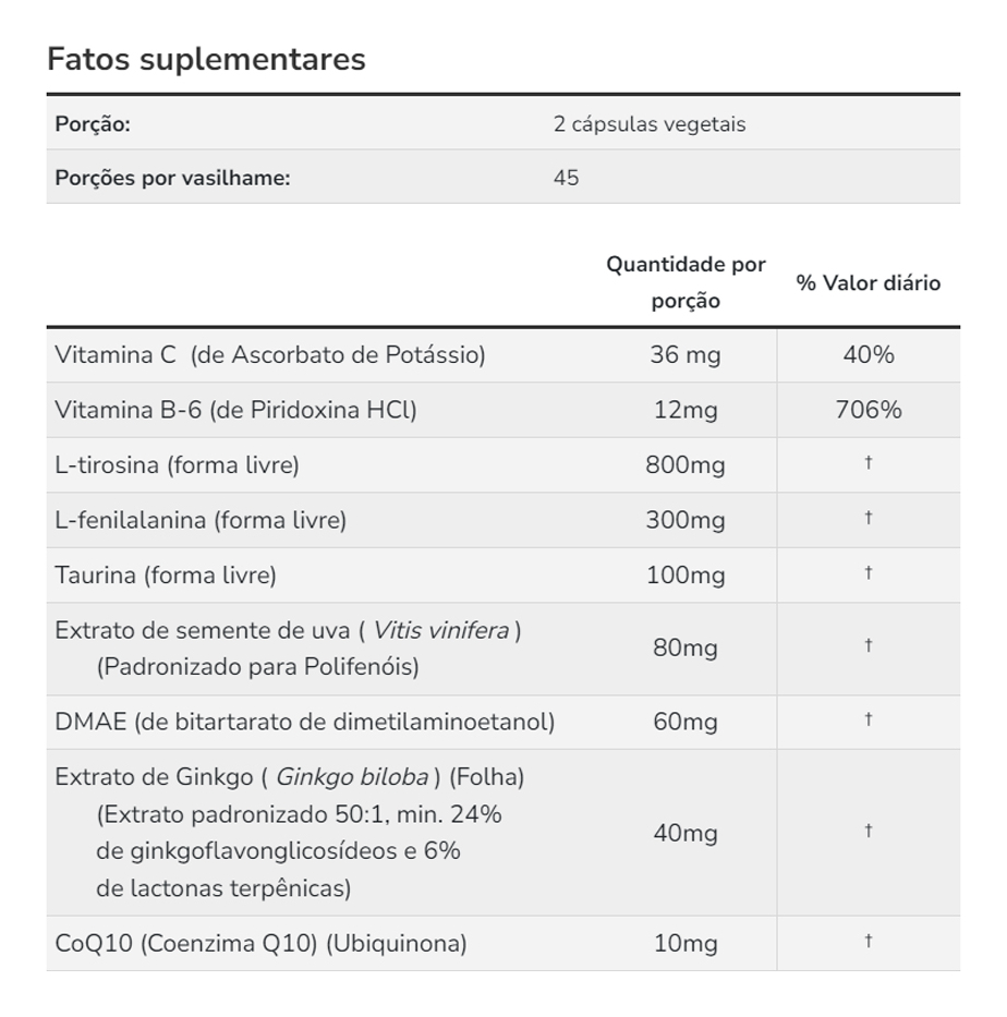 5. Composição do Produto: Cada cápsula contém uma mistura cuidadosamente selecionada de ingredientes que suportam o funcionamento cognitivo, incluindo aminoácidos, vitaminas e minerais essenciais. A formulação é desenvolvida para garantir a eficácia do produto, sem aditivos ou substâncias desnecessárias. Validade longa