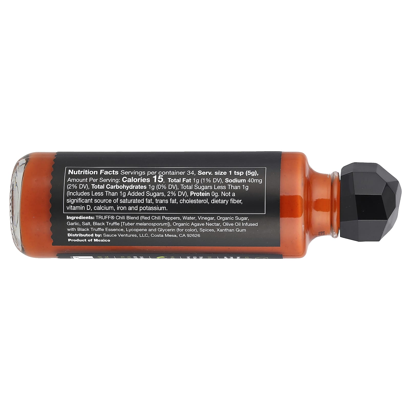 Chili Blend Truff® (pimentas vermelhas, água, vinagre, açúcar orgânico, alho, sal, trufa negra [Tber melanosporum]), néctar de agave orgânico, óleo de oliva infundido com essência de trufa negra, licopeno e glicerina (para dar cor), especiarias, goma xantana.