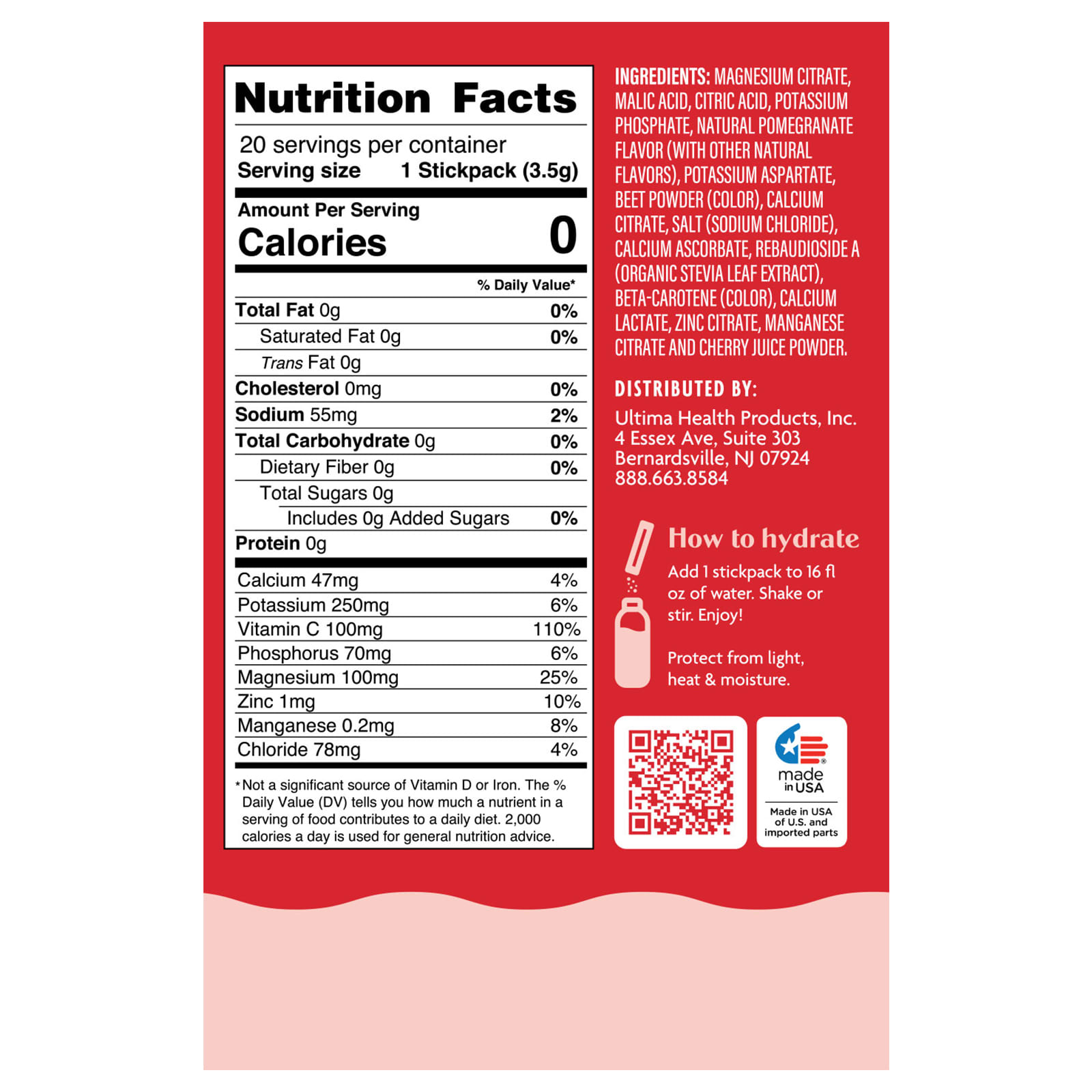 Citrato de magnésio, ácido málico, ácido cítrico, fosfato de potássio, aspartato de potássio, citrato de cálcio, sabor natural de romã (com outros sabores naturais), ascorbato de cálcio, sal (cloreto de sódio), rebaudioside A (da folha de estévia orgânica), pó da raiz de beterraba (corante), betacaroteno (corante), citrato de zinco, pó de cereja preta, citrato de manganês