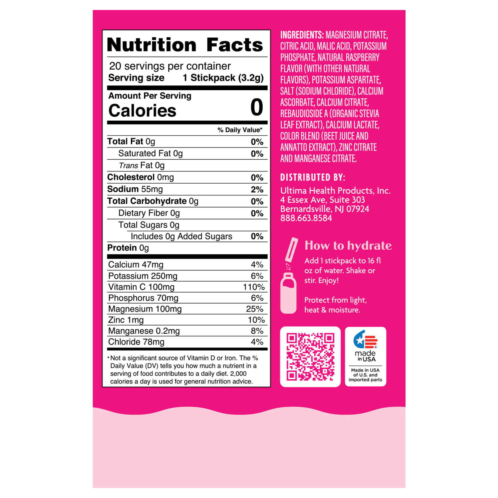 Citrato de magnésio, ácido cítrico, ácido málico, fosfato de potássio, aspartato de potássio, citrato de cálcio, sabor natural de framboesa (com outros sabores naturais), sal (cloreto de sódio), ascorbato de cálcio, rebaudioside A (da folha de estévia orgânica), mistura de cor (suco de beterraba e extrato de urucum), citrato de zinco, citrato de manganês.