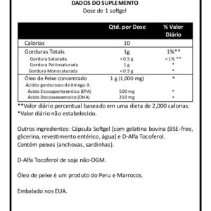 2 g grasa total, 0. 5 g grasa saturada, 1 g grasa poli-insaturada, 0. 5 g grasa monoinsaturada, 2 g concentrado de aceite de pescado, 360 mg ácido eicosapentaenoico (EPA), 240 mg ácido docosahexaenoico (DHA) |