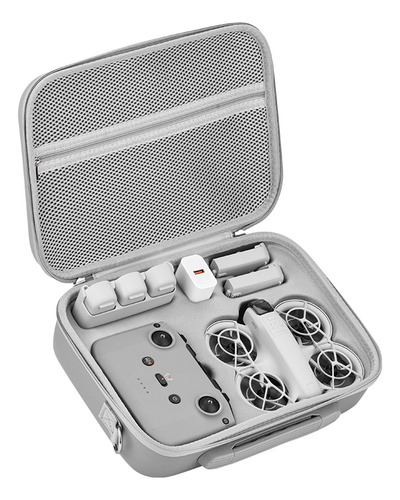 Amplo espaço de armazenamento: junto com um controle remoto, seis baterias (incluindo uma no drone) e um bolso de malha com zíper na parte superior para pequenos acessórios, como hélices, cabos de dados, filtros, joysticks e adaptadores USB.