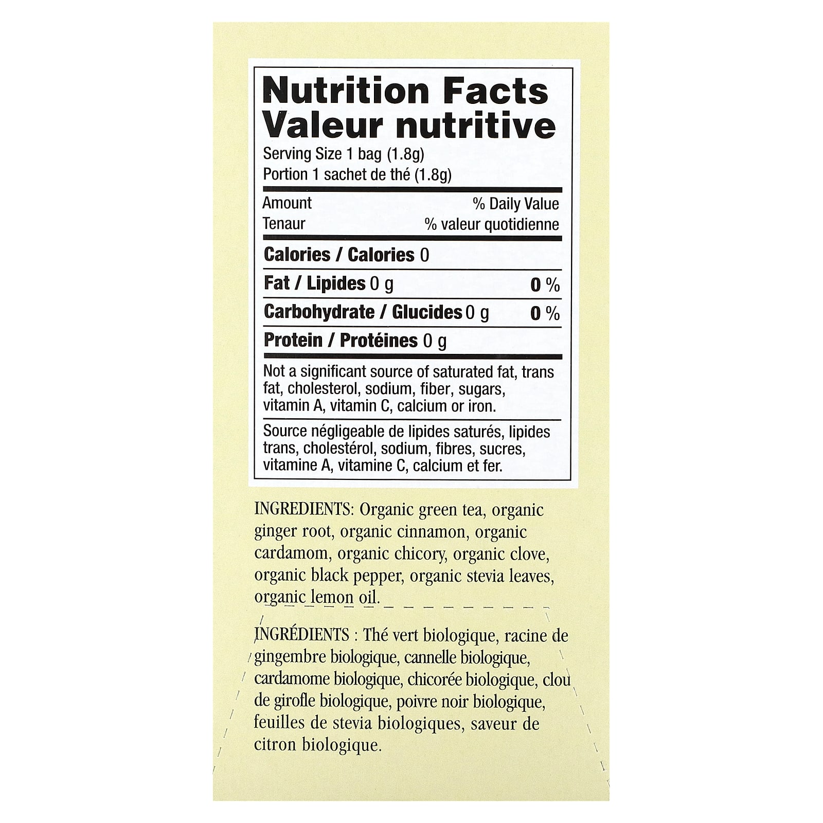 Chá verde orgânico, raiz de gengibre orgânico, canela orgânica, cardamomo orgânico, chicória orgânica, cravo orgânico, pimenta-do-reino orgânica, folhas de estévia orgânica, óleo de limão orgânico.