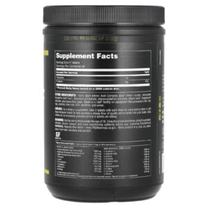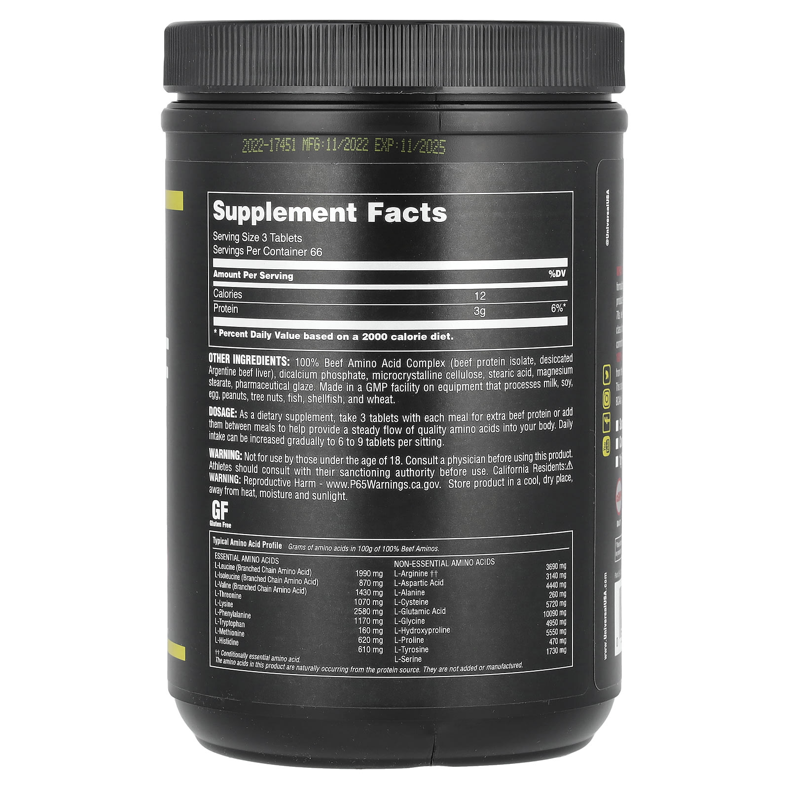 Complexo de aminoácidos 100% bovinos (proteína isolada de carne bovina, fígado bovino argentino dessecado), fosfato de cálcio dibásico, celulose microcristalina, ácido esteárico, estearato de magnésio, revestimento farmacêutico. Fabricado em uma instalação com certificação GMP em equipamentos que processam leite, soja, ovo, amendoim, frutos secos, peixe, mariscos, e trigo.