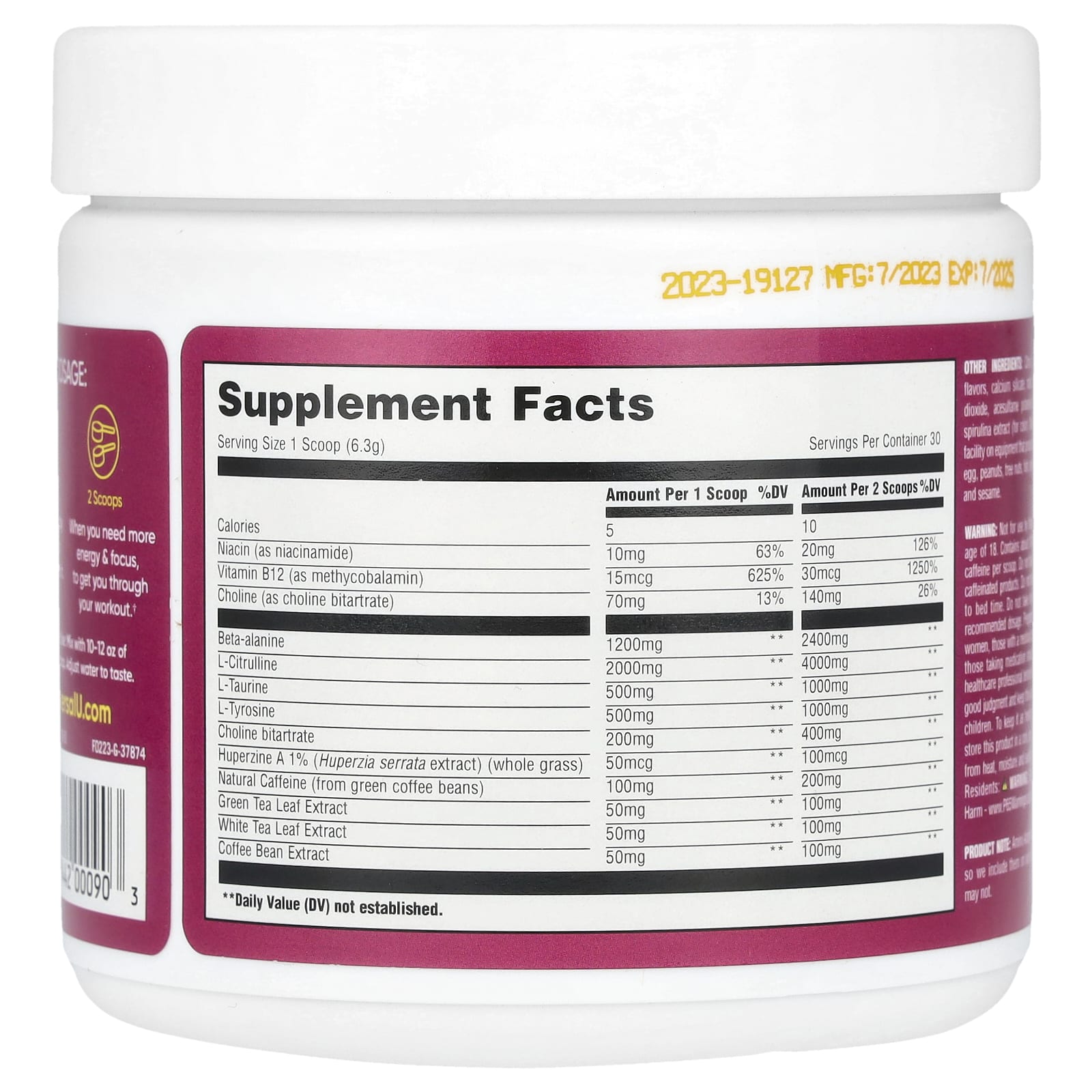 Este produto não deve ser usado por pessoas com menos de 18 anos. Contém cerca de 104 mg de cafeína total por colher medidora. Não tome com outros produtos com cafeína. Não tome muito perto da hora de dormir. Não tome mais do que a dosagem recomendada. Mulheres grávidas ou amamentando, pessoas com problemas de saúde e pessoas que estejam tomando medicamentos devem consultar um profissional de saúde antes de usar este produto. Use o bom senso e mantenha este produto fora do alcance das crianças. Para mantê-lo o mais fresco possível, guarde este produto em local fresco e seco, longe do calor, umidade e luz solar.