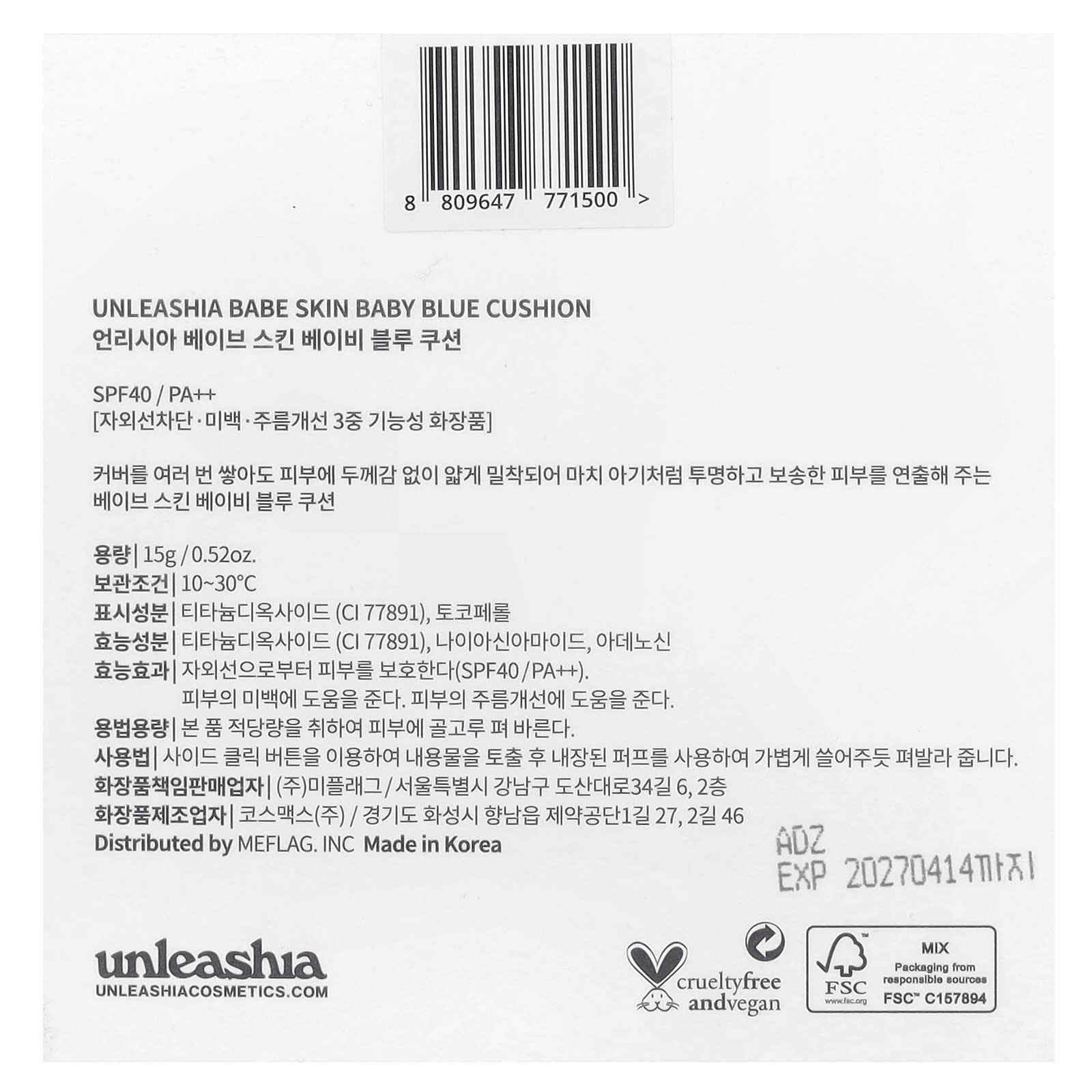 Unleashia Babe Skin Baby Blue Cushion FPS 40/PA++ 25N Good Night 15 g (052 oz) – Unleashia Beleza Maquiagem Rosto Spray e Pó Fixador Sprays e pós fixadores K-Beauty.