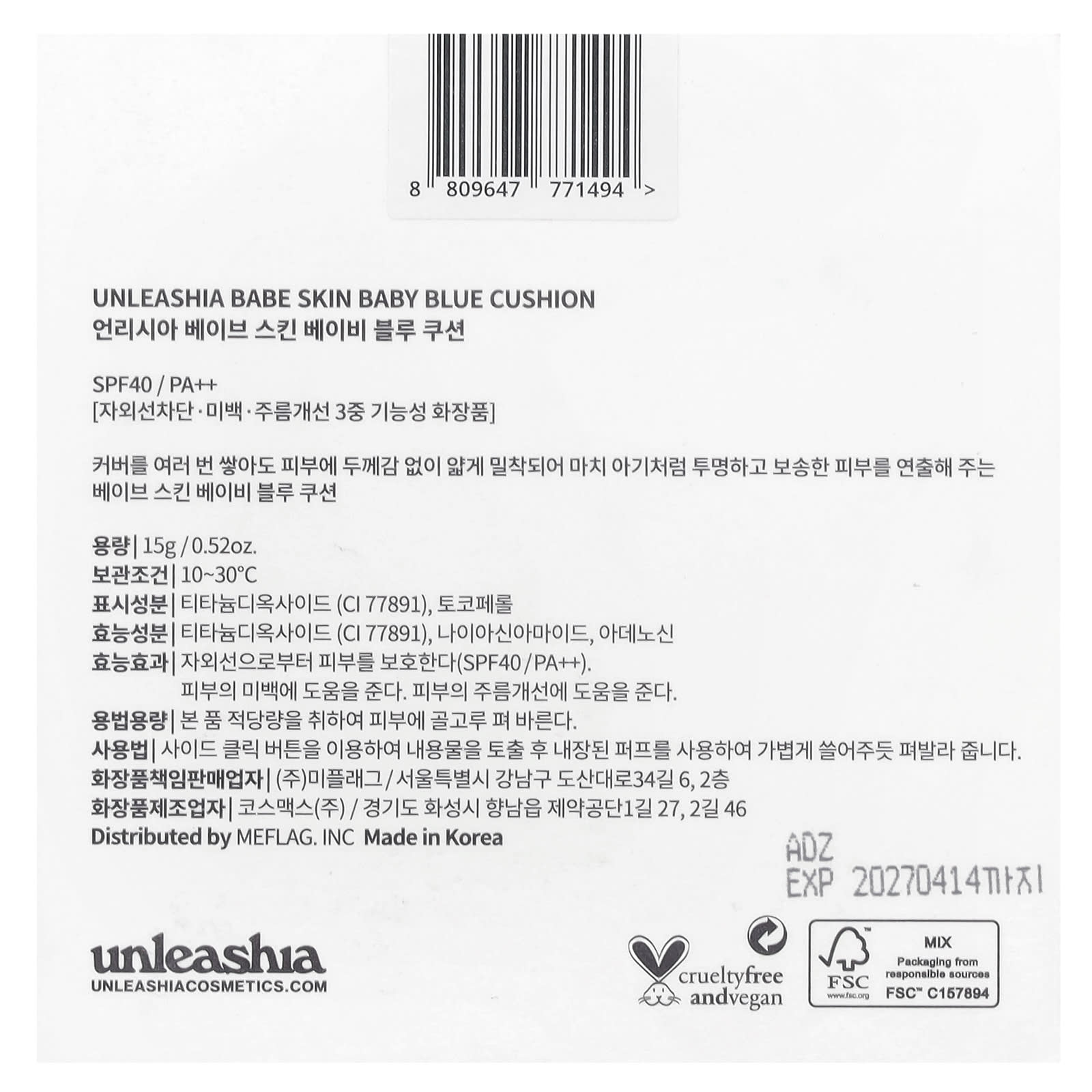 Unleashia Babe Skin Baby Blue Cushion FPS40/PA++ 23W Jolly 15 g (052 oz) – Unleashia Beleza Maquiagem Rosto Spray e Pó Fixador Sprays e pós fixadores K-Beauty.
