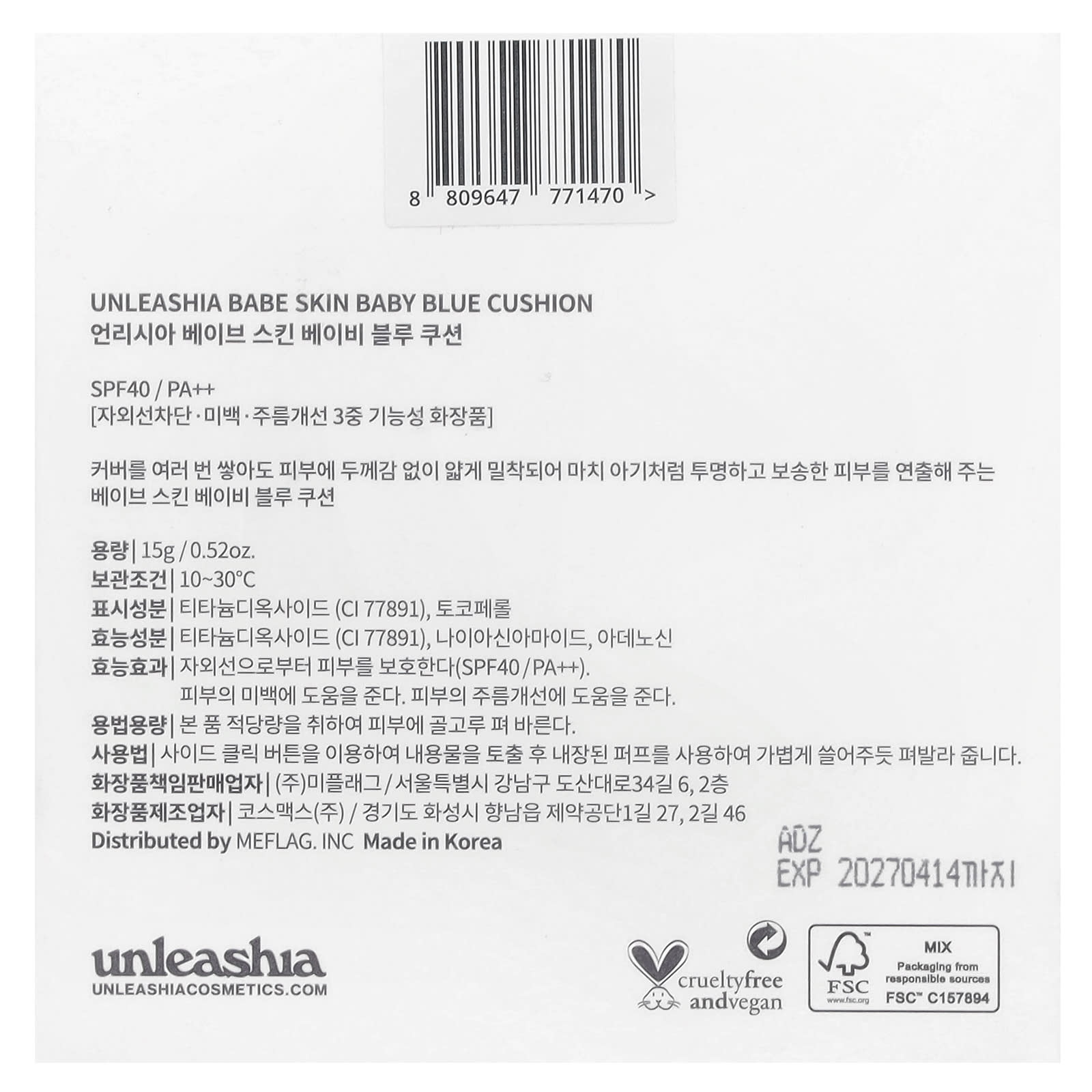 Unleashia Babe Skin Baby Blue Cushion SPF40/PA++ 17C Seraphic 15 g (052 oz) – Unleashia Beleza Maquiagem Rosto Spray e Pó Fixador Sprays e pós fixadores K-Beauty.