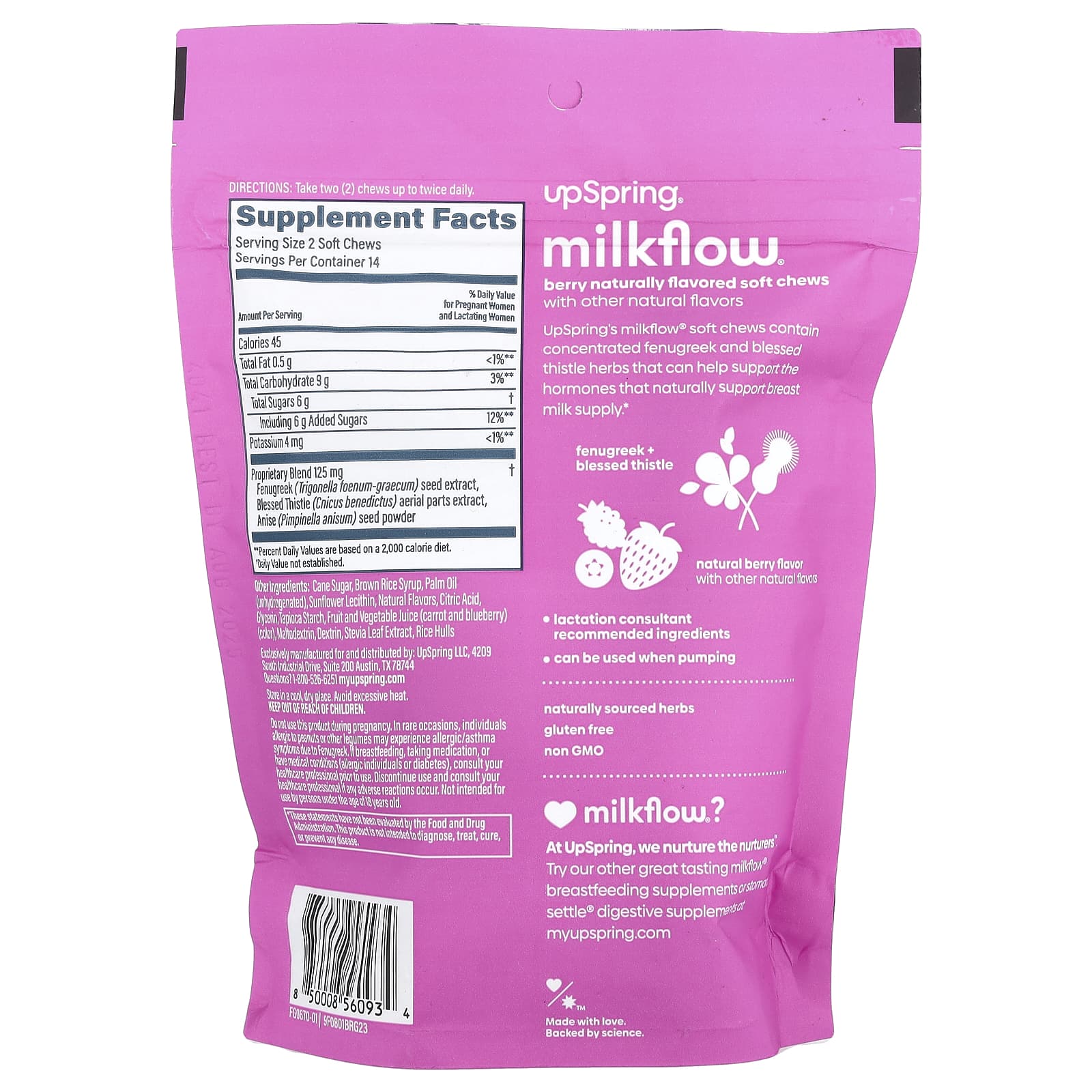 As cápsulas mastigáveis milkflow® da UpSpring contêm feno-grego concentrado e ervas de cardo-santo que podem ajudar a manter os hormônios que auxiliam naturalmente a produção de leite materno.