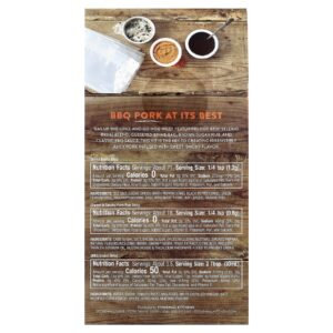 Doce & Tempero de Porco Defumado: Açúcar de cana-de-açúcar, sal, açúcar mascavo, especiarias, incluindo mostarda, páprica defumada, sabores naturais, incluindo fumaça, cebola em pó, extrato de levedura, ácido cítrico, e menos de 2% de óleo de soja, dióxido de silício e dióxido de silício adicionado fosfato tricálcico para evitar aglutinação.