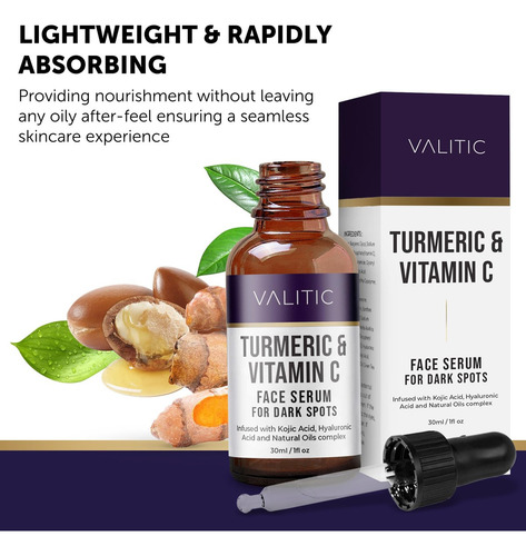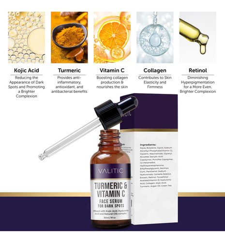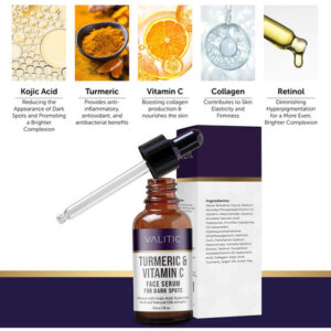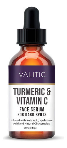 Sérum VALITIC de vitamina C antienvelhecimento e removedor de manchas escuras para rosto, cuidados com a pele com ácido hialurônico, colágeno, ácido kójico, óleo de cúrcuma Sérum facial iluminador,