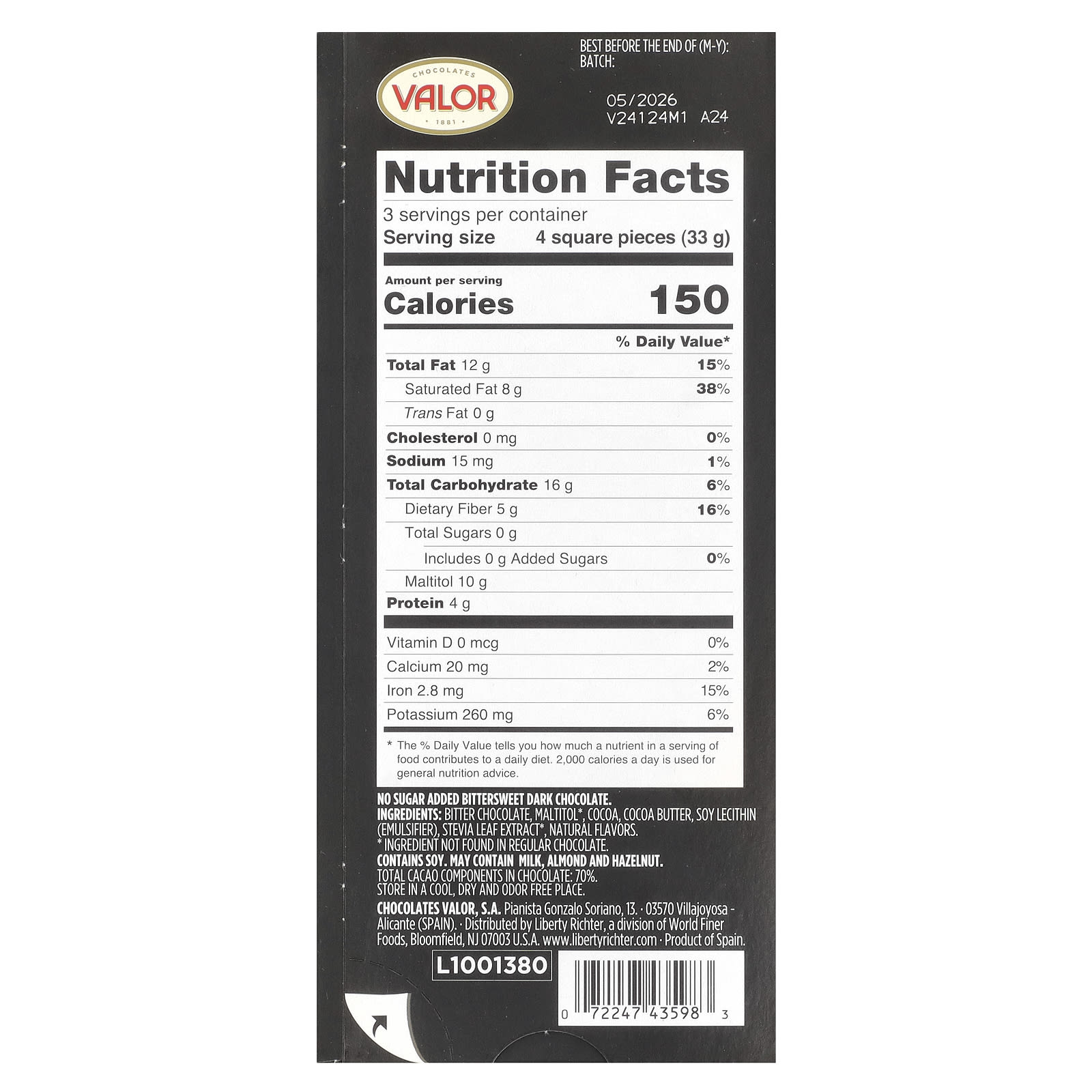 Chocolate amargo, maltitol *, cacau, manteiga de cacau, lecitina de soja (um emulsificante), extrato da folha de estévia *, sabores naturais. Componentes totais do cacau: 70%. Pode conter avelã, vestígios de amêndoa e leite. * Ingrediente não encontrado no chocolate comum.