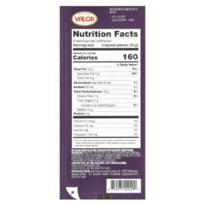 As barras de chocolate sem açúcar da Valor são feitas com alguns dos melhores grãos de cacau do mundo e com Estévia, um adoçante natural. É ideal para quem não pode consumir açúcar ou gosta de se cuidar.