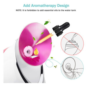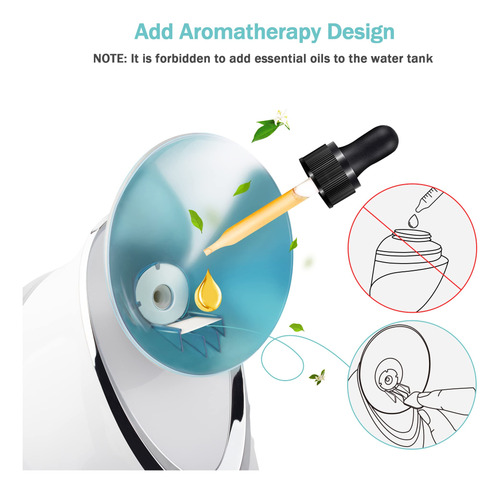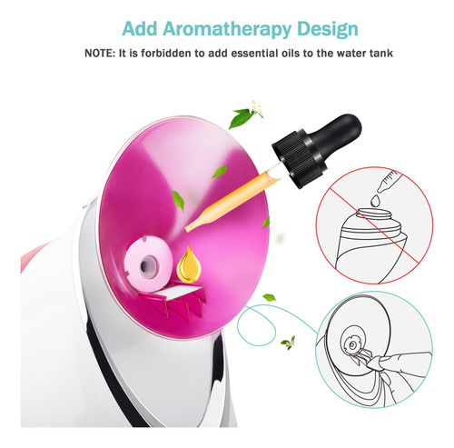 Fragrância facial e doméstica: o vaporizador facial ajuda a hidratar a pele e a desobstruir os poros para permitir uma melhor penetração. A direção do bocal e o fluxo de vapor são ajustáveis para criar o tratamento facial perfeito para relaxar em casa. Além disso, se precisar de aromaterapia, você pode colocar algumas gotas de óleo essencial nas almofadas de aromaterapia e colocá-las nos comprimidos de aromaterapia embutidos na máquina. Névoa