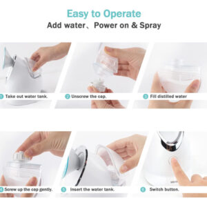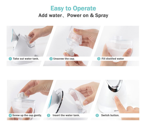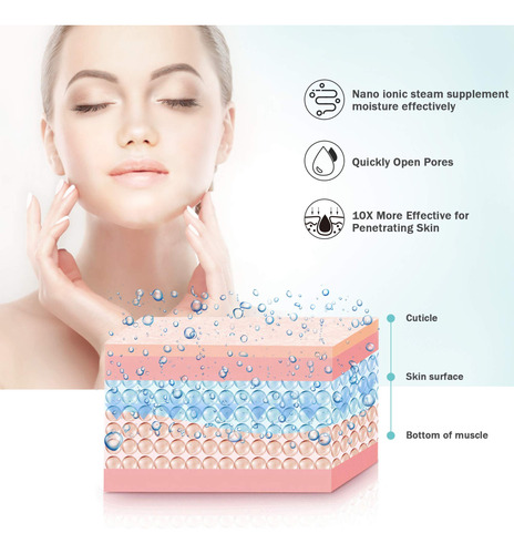 super forte: o motor a vapor facial pode liberar uma névoa fina, quente e uniforme em apenas 30 minutos e pode operar por 10 a 15 minutos seguidos. O delicado e suave vapor de nanovapor não agride a pele e também é adequado para peles sensíveis. O vaporizador será desligado somente quando o suprimento de água acabar para evitar queimaduras secas.