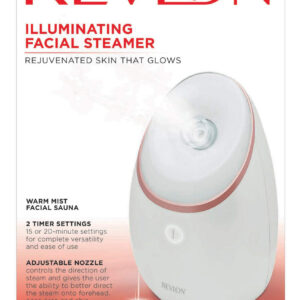 Vaporizador facial Revlon Illuminating Warm Mist — Sauna facial com névoa quente para reposição de umidade e limpeza profunda da pele — Tamanho compacto com tanque e tanque de despejo fáceis de remover. Até 20 minutos de uso com o tanque cheio – Temperatura do vapor de até 113 graus F para limpeza e hidratação profundas da pele. A uma distância de 20 cm – Possui uma função de temporizador com 2 configurações (15 min ou 20 min) para maior versatilidade e facilidade de uso – O bocal ajustável controla a direção do vapor e oferece ao usuário a capacidade de direcionar melhor o vapor para a testa, área do nariz e queixo