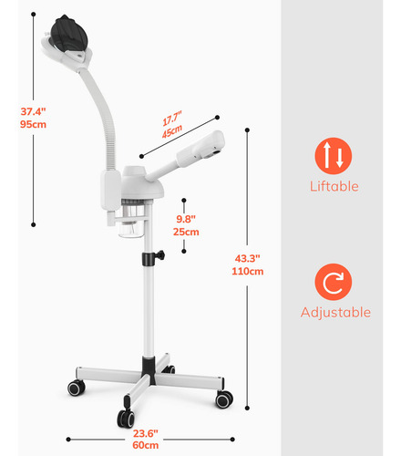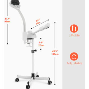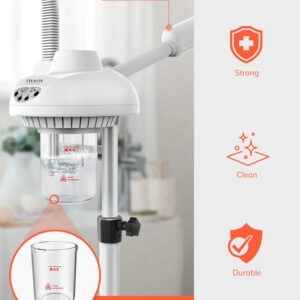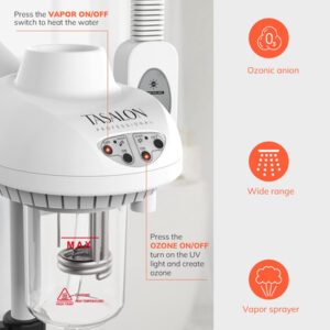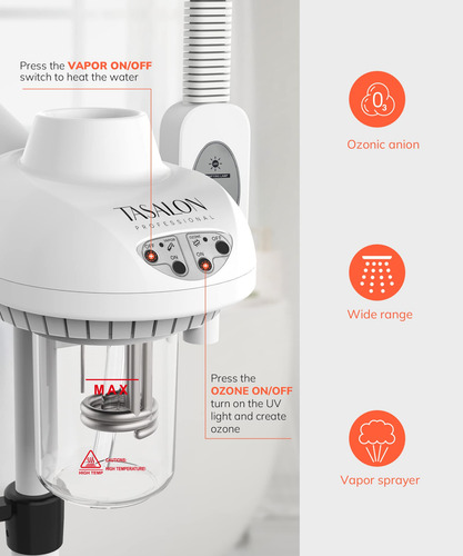 Por que escolher o vaporizador facial profissional TASALON? Para quem quer ficar linda e ter uma pele perfeita! Elimine o óleo retido e a sujeira dos poros da pele com esta máquina facial com vaporizador de spa de dupla ação. Ele produz ozônio iônico que é incorporado ao vapor. Ajuda a reduzir linhas finas e rugas para uma pele lisa. Dá à pele um brilho radiante para uma aparência mais jovem. Melhora muito a textura da pele ao limpar profundamente os poros. A luz LED desta ferramenta de beleza para a pele com braçadeira de fixação de mesa e 5 vezes a lente de aumento avalia a pele do cliente adequadamente e torna os detalhes claros. Características: vapor de ozônio iônico, tubo de aquecimento de aço inoxidável, lupa de 5 diopterias, base de suporte com rodas de 5 pernas, protetor térmico, funções de desligamento automático. Altura totalmente ajustável Quando o dispositivo é desligado automaticamente, isso pode indicar. 1. Não há água suficiente no tanque 2. Há muita água no tanque 3. A água está suja ou não é adequada para o vaporizador. Observe os seguintes cuidados: 1. Não coloque o dispositivo de cabeça para baixo ou incline quando estiver em operação; use-o somente em uma superfície nivelada. 2. Não inicie o dispositivo sem água. 3. Não use aditivos no água. 4. Limpe o tanque de água com frequência. Certifique-se de desligar a alimentação e desconectá-lo antes de retirar o tanque de água e deixe a unidade esfriar completamente. 5. Não toque no tanque de água quando estiver quente. 6. Certifique-se de drenar a água se o dispositivo não for usado por muito tempo. – Vaporizador 2 em 1: o vaporizador facial e a lâmpada de aumento são um equipamento de beleza multifuncional muito útil. O vaporizador estético pode ajudar a abrir os poros. Óleo, sujeira e sujeira podem se acumular nos poros, e essa abertura permite que eles fiquem livres. – Vaporizador facial para profissionais faciais: produz ozônio iônico que é misturado ao vapor. Dá à pele um brilho radiante para uma aparência mais jovem. Protetor térmico e funções de desligamento automático. – Lâmpada de aumento: o vaporizador facial tem lupa de 5 dioptrias e lâmpada LED com 120 lâmpadas, que brilha suavemente, sem poluição, sem brilho e não machuca seus olhos. O braço de tesoura dobrável pode facilmente ajudá-lo a observar e tornar os detalhes claros. – Fácil de ajustar: a lente do vaporizador facial pode girar 360 graus e virar para cima e para baixo em 180 graus. Altura e braço convenientemente ajustáveis em qualquer posição. Você pode hidratar convenientemente o rosto, pescoço, ombro, braço, costas e pernas quando estiver sentado ou deitado. – Escolha profissional: como vaporizador facial para esteticista, base de apoio para rodas de 4 pernas, fácil de movimentar no salão. A base robusta proporciona um bom equilíbrio durante a operação ou o movimento.