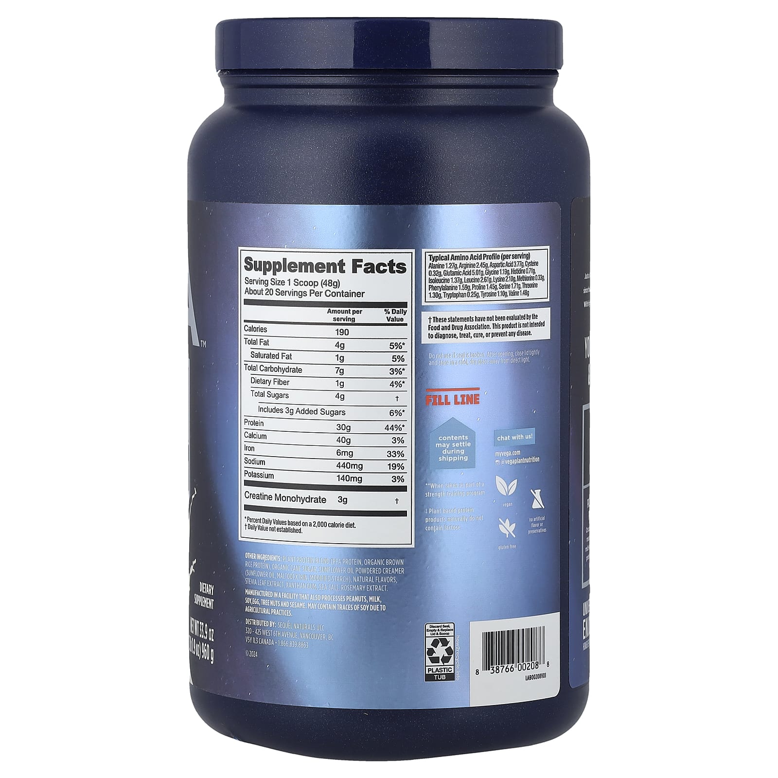 Vega Proteína à Base de Plantas para Performance + Creatina Baunilha Cremosa 960 g (2 lb 19 oz) – Vega Nutrição Esportiva Proteína Proteína Vegetal Mistura Proteica à Base de Plantas Creatina Monoidrato de creatina.