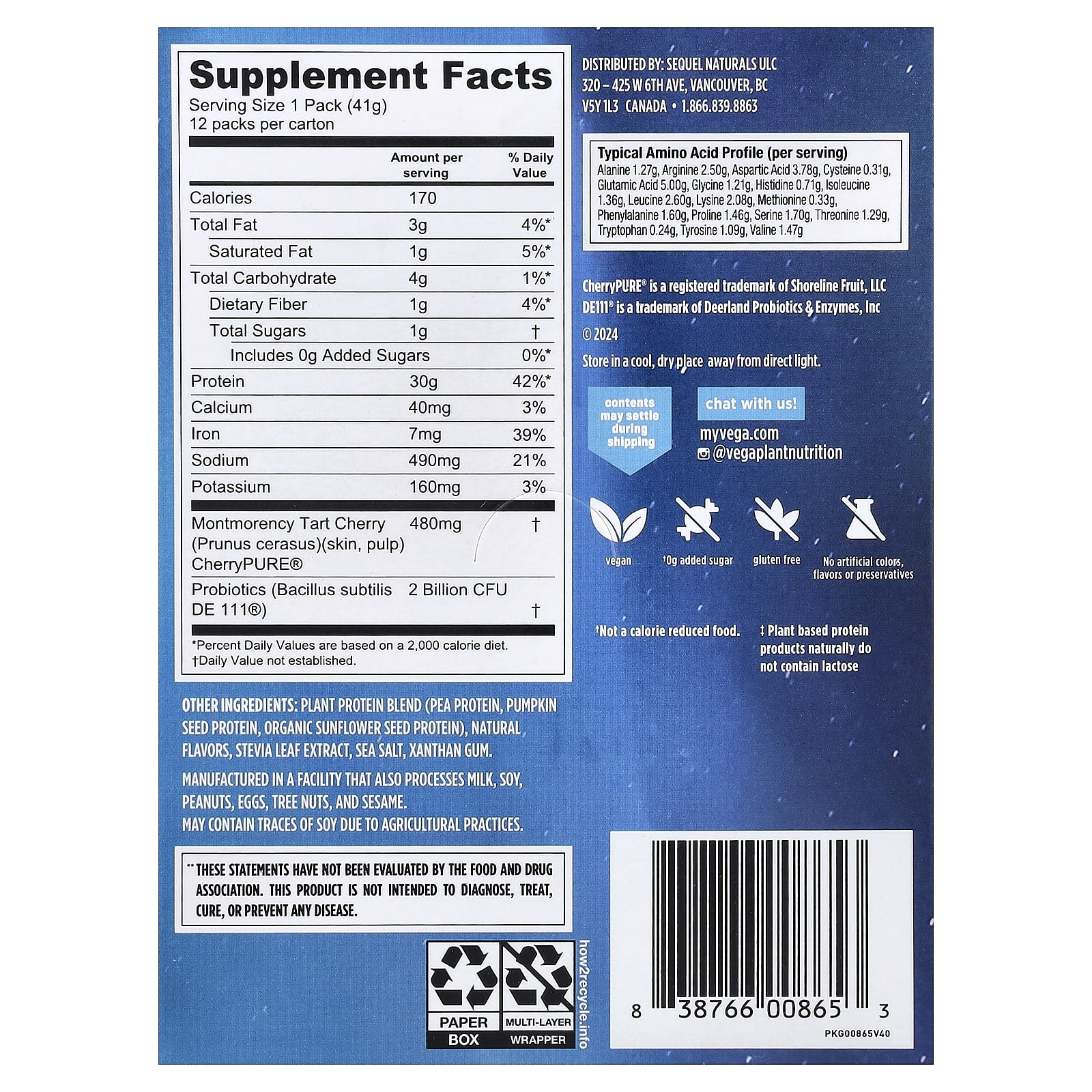 Vega Proteína à Base de Plantas Proteína para Desempenho + Recuperação Baunilha Cremosa 12 Pacotes 41 g (15 oz) Cada