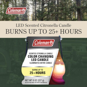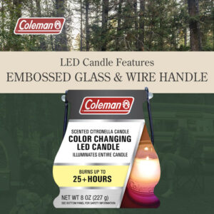 Crie um clima festivo enquanto se diverte ao ar livre com a vela LED de citronela Coleman que muda de cor. Feita com um castiçal de vidro, esta vela LED apresenta uma forma única e uma alça de arame para facilitar o transporte. Luzes LED que mudam de cor iluminam completamente a vela com cores brilhantes para um visual divertido e festivo ao ar livre. Esta vela de citronela é perfumada para adicionar um aroma agradável aos seus espaços ao ar livre, e esta vela externa queima por mais de 25 horas para uso duradouro. Configure-o em seu quintal ou use-o como uma lanterna de vela de acampamento