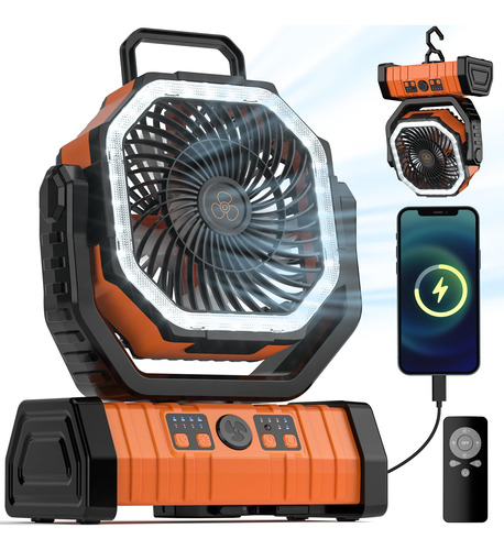 Bateria com capacidade de 20000 mAh – Bateria com capacidade de 20000 mAh Diferente de outros produtos de baixa qualidade no mercado, o ventilador de acampamento incorpora uma bateria recarregável de 20000 mAh, que pode funcionar continuamente por 12 a 58 horas, proporcionando um frescor mais duradouro. – Fique fresco onde quer que vá Com vento de 4 velocidades, este ventilador de praia o torna uma ferramenta altamente eficaz para mantê-lo fresco e confortável durante os dias quentes de verão ou em ambientes internos abafados. – Super Bright LED Camping LL AnternaO ventilador da barraca tem 3 configurações de brilho, tornando-o a fonte de luz ideal para ambientes externos noturnos atividades como churrascos, piqueniques, caminhadas e pesca. O ventilador de bateria também possui um design de gancho que pode ser facilmente pendurado na parte superior da barraca, economizando espaço. – Controle remoto e temporizador Além dos botões manuais, o ventilador é equipado com um controle remoto para suportar a operação do ventilador. – Ventilador portátil adequado para tamanho de mochila com gancho suspenso O tamanho geral do ventilador portátil é pequeno o suficiente para caber facilmente em sua mochila para facilitar o transporte e armazenamento. O design de gancho giratório e dobrável do ventilador portátil na parte inferior facilita pendurá-lo em sua barraca, galhos de árvores ou simplesmente colocá-lo em mesas em casa ou no escritório. – Carregamento bidirecional em jejum, economizando tempo. Pode carregar o ventilador rapidamente com o cabo de carregamento rápido tipo C e, ao mesmo tempo, o suporte do ventilador para carregar rapidamente o dispositivo móvel. Ambos os modos de carregamento podem economizar muito tempo ao reabastecer a bateria, sem necessidade de esperar muito tempo. – Modo de hibernação Um botão pode desligar o brilho de todas as luzes indicadoras, mesmo à noite, não afetando o sono devido ao brilho das luzes indicadoras. – Carregar seu telefone Equipado com uma bateria grande, ele pode carregar seu iPhone enquanto usa a função de ventilador.