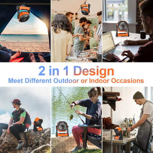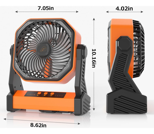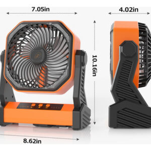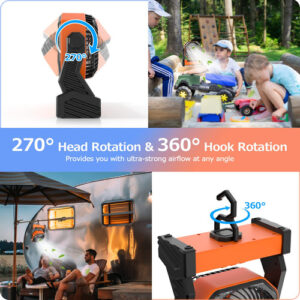 ventilador de acampamento com lanterna LED – Ventilador de acampamento recarregável de 20000 mAh Motor de alta qualidade e material ABS durável para operação silenciosa, bateria embutida de 20000 mAh, 4 velocidades de configuração para escolher, a velocidade máxima do vento pode durar 16 horas após totalmente carregada, ventilador portátil perfeito para acampar, pescar, escalar, viajar, caminhar, piquenique, churrasco, carro, festa em casa e outros locais internos e externos. – Porta de carregamento USB útil e saída tipo C embutida Porta de entrada/saída 5V/3A tipo C e uma porta de carregamento USB 5V/2A para carregar o ventilador convenientemente (tempo de carregamento de 8 a 9 horas, testado com Carregador de 5V/3A), ou use este ventilador de barraca como banco de energia para alimentar telefone, relógio esportivo, tablet ou outros dispositivos (a porta de saída tipo C não é compatível com alguns telefones). – Lanterna LED poderosa e modo de hibernação Ultra Bright. 16 luzes LED individuais, 3 configurações de brilho podem ser ajustadas, duração da bateria de até 120 horas abaixo do nível 1 (desligue com carga total). Este ventilador pessoal é bom para iluminação noturna ou lanterna de emergência para iluminar o caminho ou se posicionar bem. Pressione o modo de hibernação para desligar os indicadores da bateria e os indicadores de velocidade do ventilador. – Rotação de 270 cabeças e rotação de 360 ganchos A pequena ventoinha USB 2 em 1 é feita de base resistente e gancho durável, que pode funcionar de forma estável durante a rotação, para que você possa usá-la com confiança em várias ocasiões externas ou internas. É ótimo permitir que você obtenha fluxo de ar de diferentes direções e se refresque. – Compromisso de qualidade da marca Xumemall. Resposta ao cliente em 24 horas. Estamos sempre prontos aqui para ajudá-lo com qualquer problema que você possa ter.