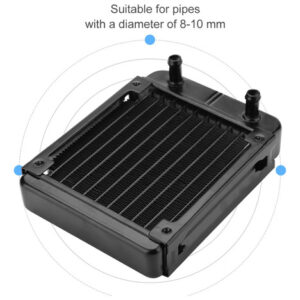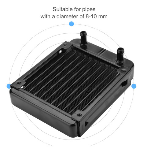 Radiador de alumínio puro com 10 tubos. As mais recentes faixas de radiação em forma de U podem efetivamente melhorar o desempenho da radiação e ter uma área de radiação maior e tecnologia de soldagem exclusiva. Há um separador de água embutido no tanque para manter a água misturada e manter a água longe do equipamento para garantir a segurança. Adequado para computador, sistema de resfriamento de água hospedeiro ou outro equipamento eletrônico profissional ou resfriamento de chipset Adequado para tubos com diâmetro de 8 a 10 mm