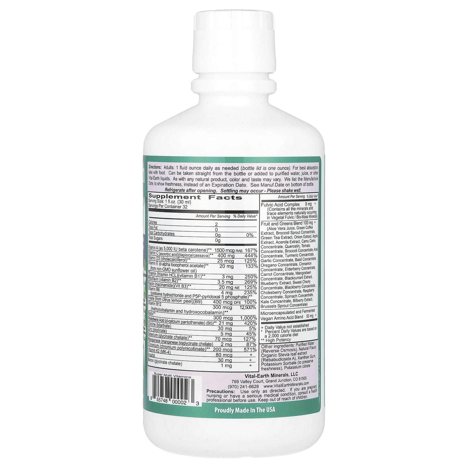Adultos: 1 onça fluida por dia, conforme necessário (a tampa do frasco equivale a uma onça). Para melhor absorção, tome com alimentos. Pode ser tomado direto da garrafa ou adicionado à água purificada, suco ou outros líquidos Vital-Earth.