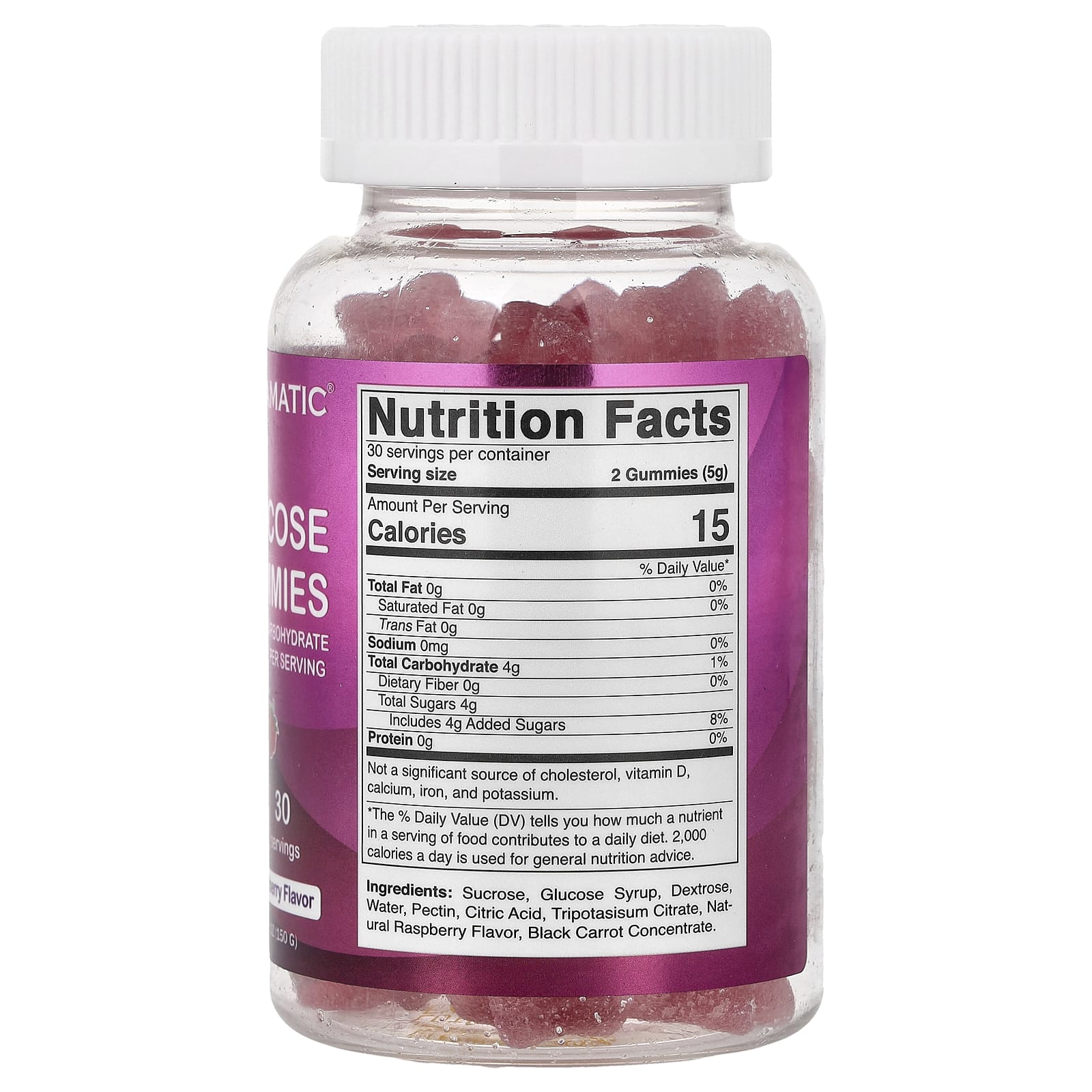 Sacarose, xarope de glicose, dextrose, Água, pectina, ácido cítrico, citrato de tripotasisum, sabor natural de framboesa, concentrado de cenoura preta.