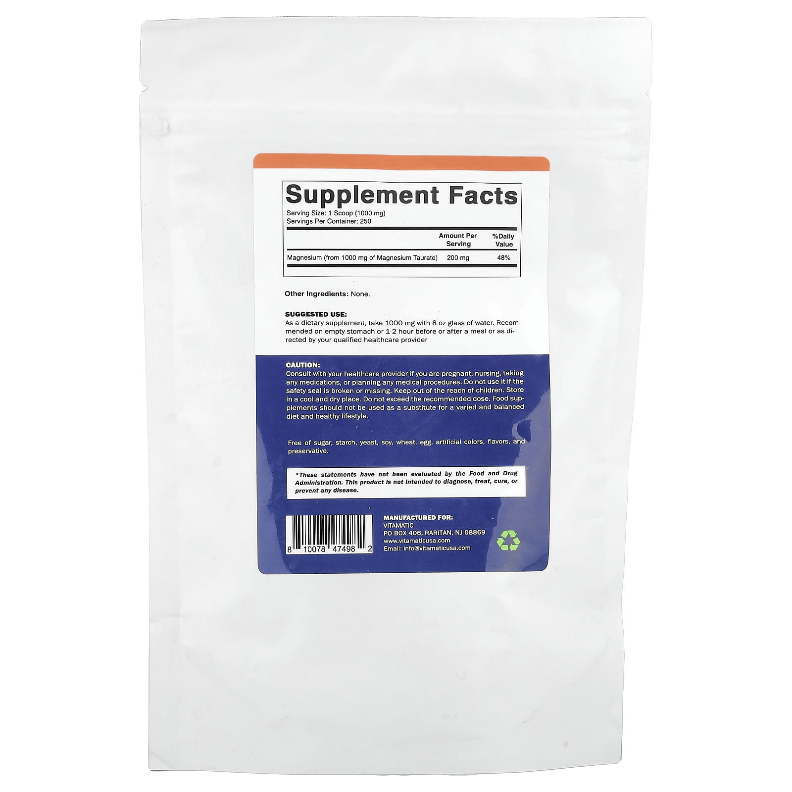 Vitamatic Taurato de Magnésio em Pó 250 g (88 oz) – Vitamatic Suplementos Minerais Magnésio.