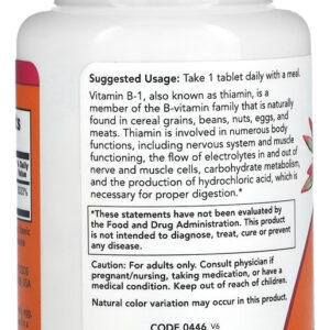 A Vitamina B-1 (Tiamina) da Now Foods fornece 100mg desta vitamina do complexo B em cada tablete; A tiamina é essencial para o metabolismo dos carboidratos, gorduras e proteínas;