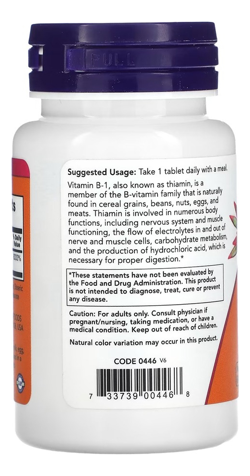 A Vitamina B-1 (Tiamina) da Now Foods fornece 100mg desta vitamina do complexo B em cada tablete; A tiamina é essencial para o metabolismo dos carboidratos, gorduras e proteínas;