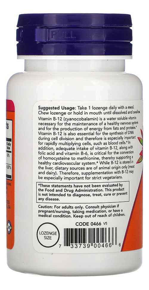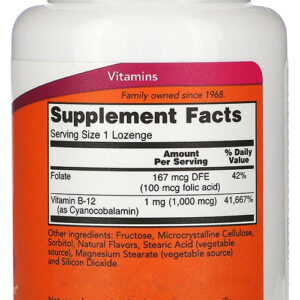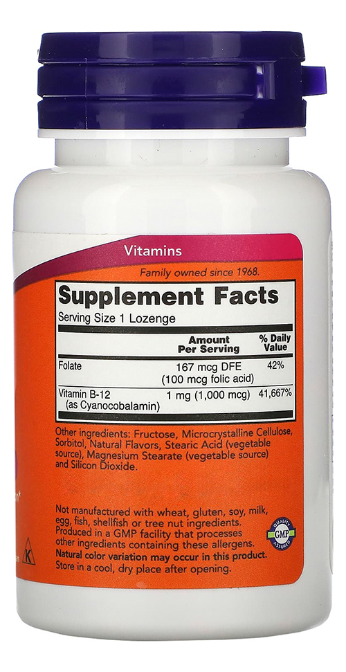 Now Foods Vitamina B-12 1mg com Ácido Fólico 100 Pastilhas / Importado A vitamina B-12 é uma substância essencial e necessária para a produção de energia, sendo também conhecida por seu papel importante na síntese de Ácido Desoxirribonucleico e no metabolismo da homocisteína. A vitamina B-12 também tem sido considerada especialmente crítica para dar suporte ao bem-estar. Com esta fórmula desenvolvida pela Now Foods, você pode complementar facilmente sua dieta alimentar com as quantidades necessárias desta substância juntamente com ácido fólico, que é fundamental para a conversão de homocisteína em metionina. Fabricado sem trigo, glúten, soja, leite, ovo, peixe, marisco ou nozes. Outros Ingredientes: Frutose, Celulose Microcristalina, Sorbitol, Sabores Naturais, Ácido Esteárico (fonte vegetal), Estearato de Magnésio (fonte vegetal) e Dióxido de Silício. Recomendações de uso: Tome 1 pastilha por dia com uma refeição. Mastigue a pastilha ou segure na boca até dissolver e engula. Cuidados: Apenas para adultos. Busque orientação se estiver grávida ou amamentando. Mantenha fora do alcance de crianças. Dimensões: 4,6 x 4,6 x 8,9 cm Peso: 0,056 1x frasco 100 Pastilhas VIDE VALIDADE