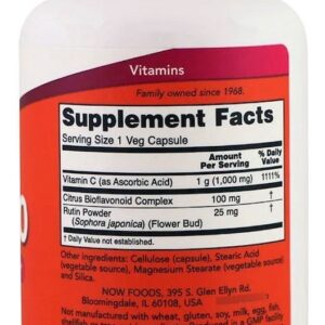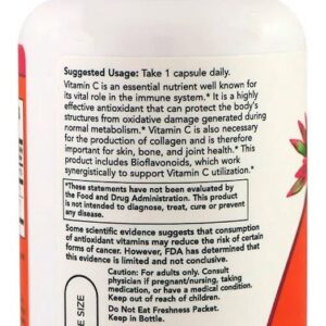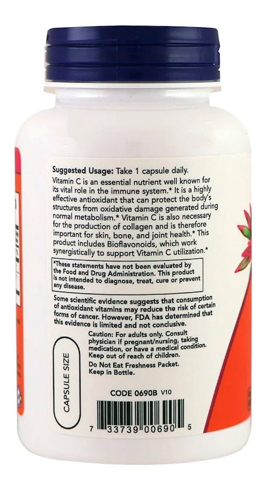 Vitamina C 1000mg Now Foods 100Veg Caps Encontrada naturalmente em frutas e legumes, a Vitamina C corresponde a um composto solúvel que não pode ser produzido ou armazenado. A fórmula de alta potência apresentada pela Now Foods permite que você desfrute de cápsulas de 1000mg desse nutriente essencial para suporte ao sistema imunológico e cujas propriedades defensivas e antioxidantes atuam de forma ainda mais eficiente quando associadas aos bioflavonóides que trabalham de forma sinérgica para promover a absorção desta substância pelo organismo. OUTROS INGREDIENTES: Hipromelose (cápsula de celulose), Ácido Esteárico (fonte vegetal), Estearato de Magnésio (fonte vegetal) e Dióxido de Silício. RECOMENDAÇÕES DE USO: Tomar 1 cápsula por dia. CUIDADOS: Apenas para adultos. Se estiver grávida ou amamentando, busque orientação antes de usar este produto. Mantenha fora do alcance de crianças. ARMAZENAMENTO: Guarde em local fresco e seco após a abertura. Pode ocorrer variação natural da cor neste produto. CONTEÚDO DO FRASCO: 100 Cápsulas Vegetarianas. VIDE VALIDADE 30/01/2025