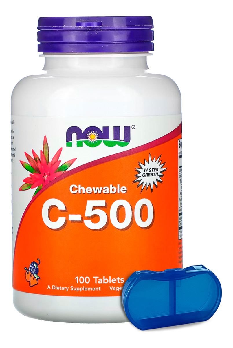 Vitamina C-500 Now Foods 100 Tablets Sabor Cereja + Porta Cápsulas