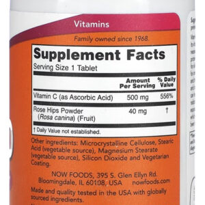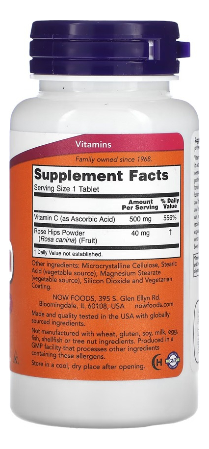 Vitamina C 500mg com Rosa Mosqueta Now Foods 100tab PROTEÇÃO ANTIOXIDANTE : Os comprimidos de C-500 agora fornecem uma dose diária de vitamina C, que é necessária para a produção de colágeno e, portanto, também importante para pele, ossos e articulações saudáveis. Com Rosa Mosqueta: Rosa Mosqueta, uma fonte natural de ácido ascórbico. Certificações / classificações: Sem OGM, Vegan / Vegetariano, Sem Soja, Baixo Sódio, Kosher, Feito Sem Glúten GMP Quality Guaranteed – A certificação GMP com classificação NPA A significa que todos os aspectos do processo de fabricação NOW foram examinados, incluindo métodos de laboratório / teste (para estabilidade, potência e formulação do produto). .