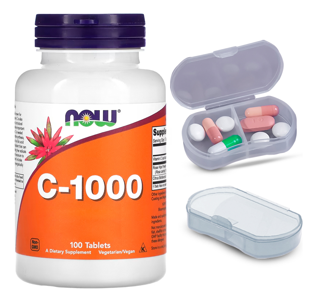 Kit Vitamina C e Rosa Mosqueta Now Foods 100Tabs + Porta Cápsulas Destaque Principal: A Vitamina C 1000mg com Rosa Mosqueta da Now Foods é ideal para quem busca um complemento para o equilíbrio natural do corpo, com o Destaque adicional dos componentes da rosa mosqueta. Vantagem da Forma de Apresentação: Os tabletes de 1000mg oferecem uma forma conveniente e eficiente de consumir Vitamina C, facilitando a ingestão e garantindo uma dosagem consistente e eficaz. Produto Importado com Entrega Imediata: Este suplemento é importado, assegurando a alta qualidade e confiabilidade da marca Now Foods. Disponível para pronta entrega, facilita a aquisição rápida e sem complicações. Porta Cápsulas com Duas Repartições: O kit também inclui um porta-cápsulas prático, dividido em duas seções internas. Isso permite uma organização eficaz e separada de diferentes tipos de cápsulas ou pílulas. Composição do Produto: Cada tablete contém 1000mg de Vitamina C e um complemento de Rosa Mosqueta, formulados sem aditivos artificiais, focando na pureza e eficácia dos ingredientes. VALIDADE LONGA
