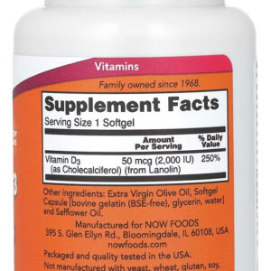 Mantenha sua saúde óssea e imunológica em dia com o Suplemento Now Foods Vitamina D-3 2000 IU. Ideal para adultos que buscam fortalecer o corpo com uma dose diária de bem-estar, este suplemento é composto por ingredientes de alta qualidade, incluindo azeite de oliva extra virgem e óleo de cártamo, garantindo a máxima absorção e eficácia.
