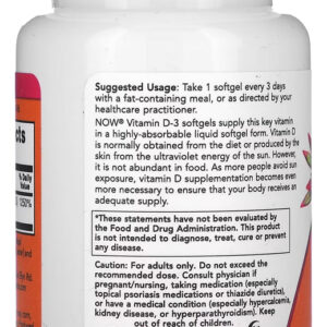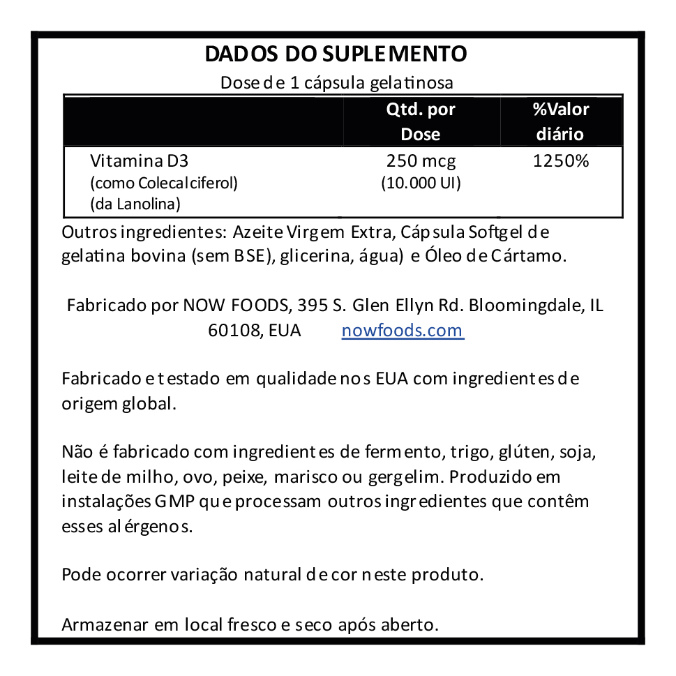 Vitamina D3 10000IU Alta potencia Now 120 Softgels  – Importado  A Vitamina D geralmente é obtida a partir da dieta ou produzida pela pele a partir do sol. No entanto, não é abundante em alimentos e cada vez mais as pessoas evitam a exposição ao sol. Assim, a suplementação de vitamina D se torna ainda mais necessária para garantir que o organismo receba um suprimento adequado deste nutriente. De acordo com estudos, a vitamina D pode auxiliar no tratamento de câncer, infertilidade, auxilia o sistema imunológico, memória, manutenção de força muscular, prevenção de acidente vascular cerebral, redução de inflamação e inúmeros outros benefícios.  VALIDADE LONGA.