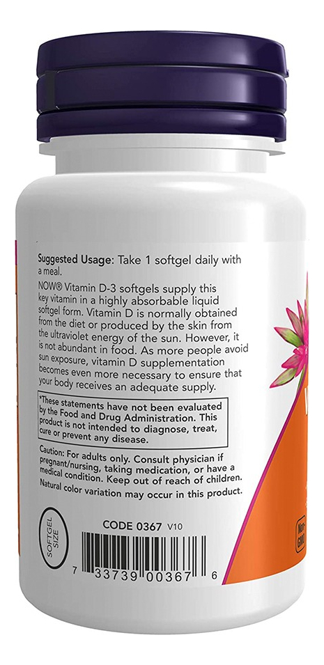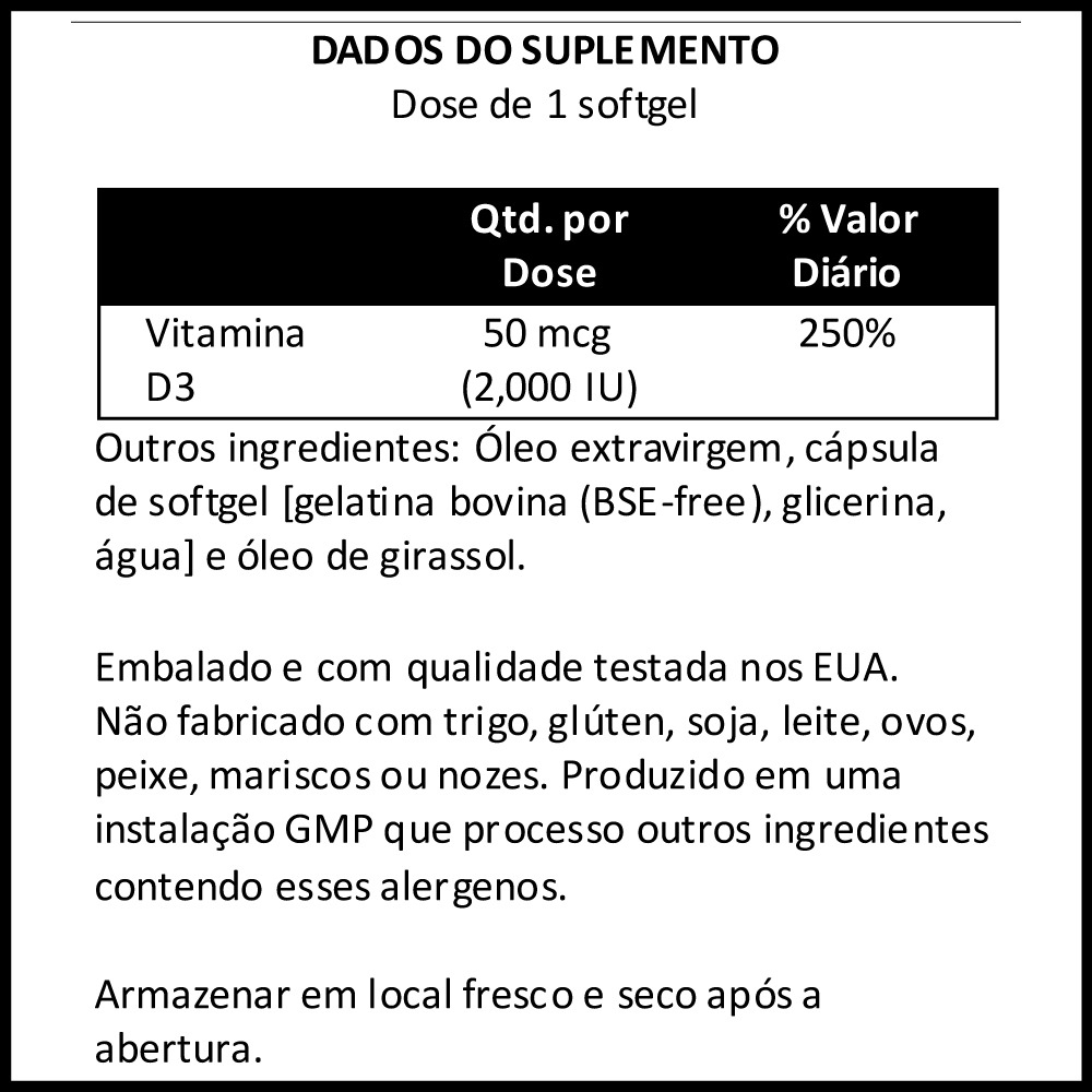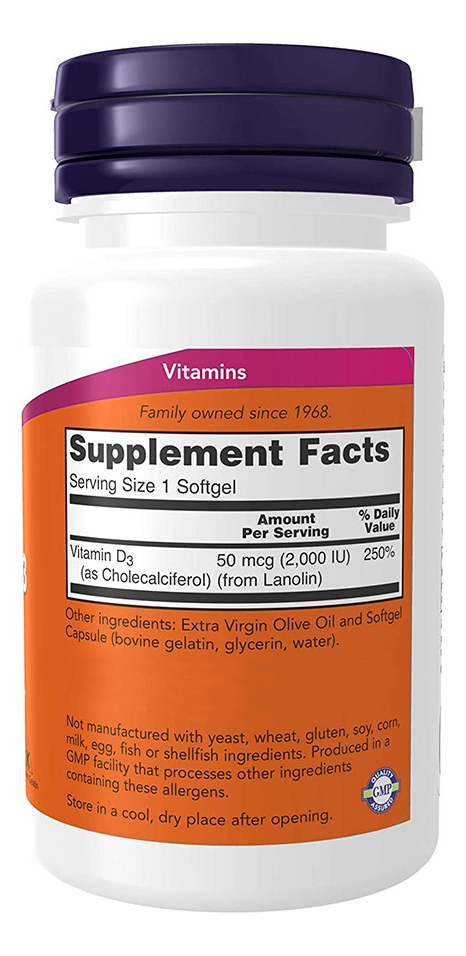 Disponível em cápsulas de softgels líquidas de rápida absorção e fórmula de alta potência de 2.000 IU, a Vitamina D3 da Now Foods é a escolha certa para complementar sua dieta alimentar com as quantidades necessárias desta substância que apresenta suporte indispensável a mineralização óssea, bem-estar e fortalecimento do organismo, uma vez que atua não somente nos processos de multiplicação e diferenciação celular, mas também auxiliando na absorção de cálcio e fósforos pelo corpo, substâncias importantes para o crescimento ósseo. Uma dose por dia é tudo que você irá precisar. OUTROS INGREDIENTES: Azeite Virgem Extra e Cápsula Softgel (gelatina bovina, glicerina, água). Fabricado sem fermento, trigo, glúten, soja, milho, leite, ovo, peixe ou ingredientes de marisco. RECOMENDAÇÕES DE USO: Tome 1 cápsula de softgels diariamente com uma refeição CUIDADOS: Apenas para adultos. Busque orientação antes de utilizar este produto se estiver grávida ou amamentando. Mantenha fora do alcance de crianças ARMAZENAMENTO: Armazenar em local seco e fresco após a abertura. Pode ocorrer variação natural da cor neste produto. CONTEÚDO DO FRASCO: 120 Softgels Acompanha 1 Porta Cápsulas, Validade Longa.