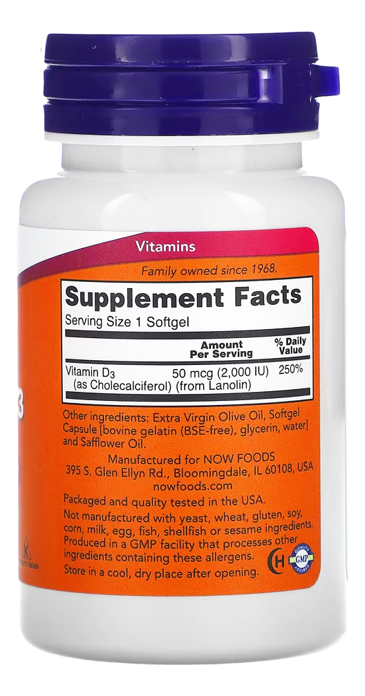 Disponível em cápsulas de softgels líquidas de rápida absorção e fórmula de alta potência de 2.000 IU, a Vitamina D3 da Now Foods é a escolha certa para complementar sua dieta alimentar com as quantidades necessárias desta substância que apresenta suporte indispensável a mineralização óssea, bem-estar e fortalecimento do organismo, uma vez que atua não somente nos processos de multiplicação e diferenciação celular, mas também auxiliando na absorção de cálcio e fósforos pelo corpo, substâncias importantes para o crescimento ósseo. Uma dose por dia é tudo que você irá precisar. OUTROS INGREDIENTES: Azeite Virgem Extra e Cápsula Softgel (gelatina bovina, glicerina, água). Fabricado sem fermento, trigo, glúten, soja, milho, leite, ovo, peixe ou ingredientes de marisco. RECOMENDAÇÕES DE USO: Tome 1 cápsula de softgels diariamente com uma refeição CUIDADOS: Apenas para adultos. Busque orientação antes de utilizar este produto se estiver grávida ou amamentando. Mantenha fora do alcance de crianças ARMAZENAMENTO: Armazenar em local seco e fresco após a abertura. Pode ocorrer variação natural da cor neste produto. CONTEÚDO DO FRASCO: 120 Softgels Validade Longa
