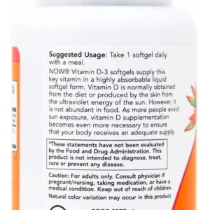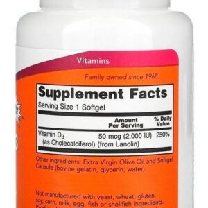 Vitamina D3 2000 IU Alta Potência Now Foods 240Softgls Disponível em cápsulas de softgels líquidas de rápida absorção e fórmula de alta potência de 2.000 IU, a Vitamina D3 da Now Foods é a escolha certa para complementar sua dieta alimentar com as quantidades necessárias desta substância que apresenta suporte indispensável a mineralização óssea, bem-estar e fortalecimento do organismo, uma vez que atua não somente nos processos de multiplicação e diferenciação celular, mas também auxiliando na absorção de cálcio e fósforos pelo corpo, substâncias importantes para o crescimento ósseo. Uma dose por dia é tudo que você irá precisar. OUTROS INGREDIENTES: Azeite Virgem Extra e Cápsula Softgel (gelatina bovina, glicerina, água). Fabricado sem fermento, trigo, glúten, soja, milho, leite, ovo, peixe ou ingredientes de marisco. RECOMENDAÇÕES DE USO: Tome 1 cápsula de softgels diariamente com uma refeição CUIDADOS: Apenas para adultos. Busque orientação antes de utilizar este produto se estiver grávida ou amamentando. Mantenha fora do alcance de crianças ARMAZENAMENTO: Armazenar em local seco e fresco após a abertura. Pode ocorrer variação natural da cor neste produto. CONTEÚDO DO FRASCO: 240 Softgels VIDE VALIDADE