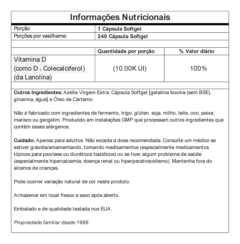 Kit Vitamina D3 250mcg Now Foods 240 Softgels + Porta Cápsulas Apoio ao Bem-Estar Geral: A Vitamina D3 é conhecida por seu papel no apoio ao bem-estar geral, proporcionando um complemento efetivo à sua rotina diária. Este produto foi desenvolvido para atender às necessidades de quem procura um suporte nutricional balanceado. Softgels Práticos e Fáceis de Ingerir: Com um frasco contendo 240 softgels, a Vitamina D3 da Now Foods oferece uma forma conveniente e fácil de consumir. Os softgels são projetados para serem fáceis de engolir, ideal para a inclusão diária no seu regime nutricional. Produto Importado com Disponibilidade Imediata: Este suplemento é importado, assegurando qualidade e eficácia. Com disponibilidade para pronta entrega, você pode começar a utilizar o produto imediatamente, sem atrasos na entrega. Porta Cápsulas com Duas Repartições: O kit também inclui um porta-cápsulas prático, dividido em duas seções internas. Isso permite uma organização eficaz e separada de diferentes tipos de cápsulas ou pílulas. Destaques da Composição Nutricional: Cada softgel contém 250mcg de Vitamina D3, oferecendo uma dosagem eficiente para complementar suas necessidades nutricionais. A Vitamina D3 é essencial para várias funções do corpo, contribuindo para um equilíbrio nutricional. VALIDADE LONGA