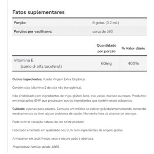 2. Apresentação Prática e Eficiente: Este frasco de 118ml oferece uma forma conveniente de incluir a Vitamina E na sua rotina diária. A embalagem facilita o uso, permitindo que você controle a quantidade aplicada de acordo com suas necessidades pessoais.