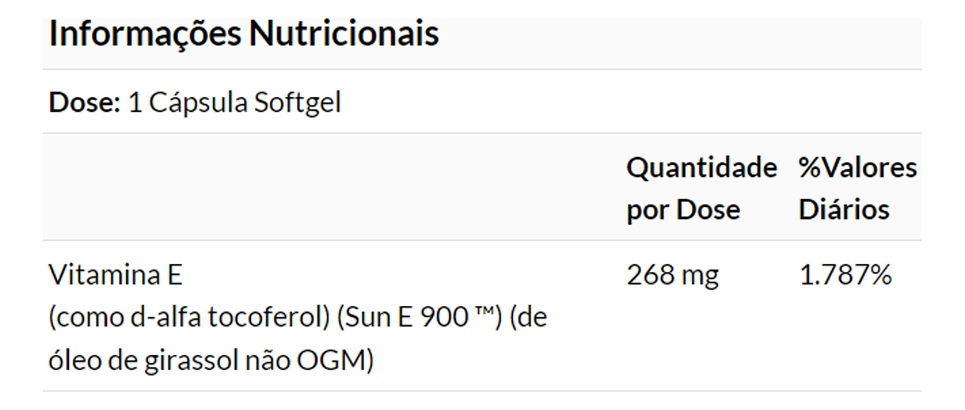 5. Composição Nutritiva e Específica: Cada softgel contém 268mg de Vitamina E na forma de Sun-E 400, derivada de óleo de girassol. Esta formulação específica oferece uma fonte de vitamina E altamente eficaz e adequada para diversas dietas. VALIDADE LONGA