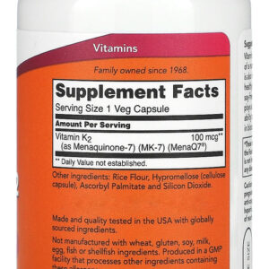 Now Foods MK-7 Vitamina K-2 100mcg 120 Cápsulas Vegetarianas Suporte ao Desenvolvimento Ósseo e Cardiovascular / No Brasil A vitamina K é bastante conhecida por seu papel na síntese de uma série de fatores, bem como pela importância para a formação de ossos fortes. A MenaQ7 ou MK-7 é uma forma biodisponível de vitamina K-2 que desempenha um papel importante no bem-estar do organismo e coração. Disponível em uma forma de 100mg e em cápsulas vegetarianas fáceis de ingerir, a fórmula desenvolvida pela Now Foods pode apresentar suporte indispensável à sua dieta alimentar para fornecer as quantidades necessárias dessa substância tão importante. Outros Ingredientes: Farinha de Arroz, Hipromelose (cápsula de celulose), Palmitato de Ascorbila e Dióxido de Silício. Recomendações de uso: Tome 1 cápsula por dia com uma refeição. Cuidados: Apenas para adultos. Pode ocorrer variação natural da cor neste produto. Mantenha fora do alcance de crianças. Guarde em local fresco e seco após a abertura. Dimensões: 4,8 x 4,8 x 10,5 cm Peso: 0,084 1x Frasco com 120 Caps Veg VIDE VALIDADE