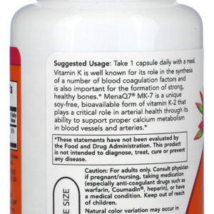 Now Foods MK-7 Vitamina K-2 100mcg 60 Cápsulas Vegetarianas Suporte ao Desenvolvimento Ósseo e Cardiovascular / Importado-TOPSHOP A vitamina K é bastante conhecida por seu papel na síntese de uma série de fatores, bem como pela importância para a formação de ossos fortes. A MenaQ7 ou MK-7 é uma forma biodisponível de vitamina K-2 que desempenha um papel importante no bem-estar do organismo e coração. Disponível em uma forma de 100mcg e em cápsulas vegetarianas fáceis de ingerir, a fórmula desenvolvida pela Now Foods pode apresentar suporte indispensável à sua dieta alimentar para fornecer as quantidades necessárias dessa substância tão importante. Outros Ingredientes: Farinha de Arroz, Hipromelose (cápsula de celulose), Palmitato de Ascorbila e Dióxido de Silício. Recomendações de uso: Tome 1 cápsula por dia com uma refeição. Cuidados: Apenas para adultos. Pode ocorrer variação natural da cor neste produto. Mantenha fora do alcance de crianças. Guarde em local fresco e seco após a abertura. Dimensões: 8,0 x 4,0 x 4,0 cm Peso: 0,052 1x Frasco com 60 Caps Veg Acompanha 1 Porta Cápsulas, Validade Longa..