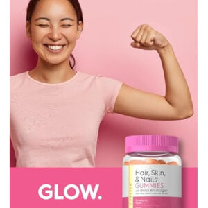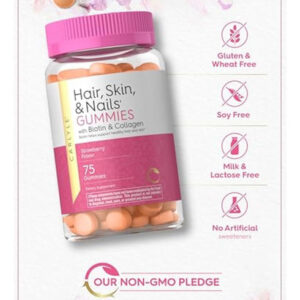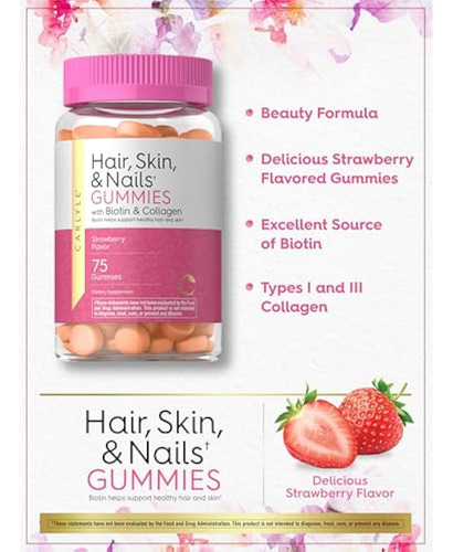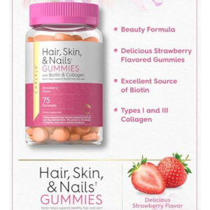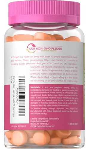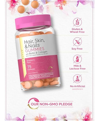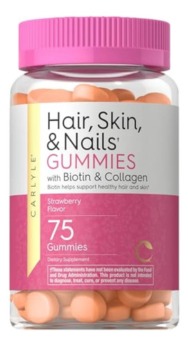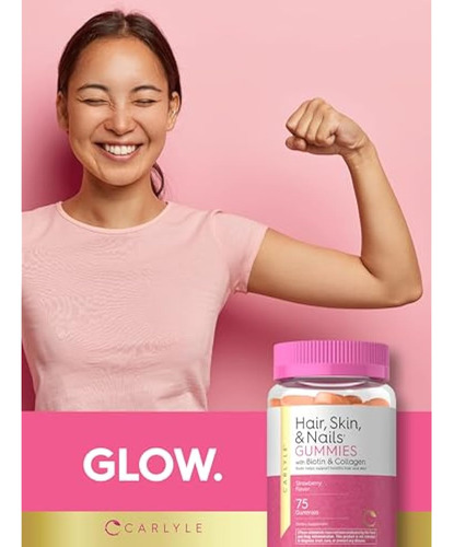 Vitaminas Carlyle para cabelos, pele e unhas, 75 gomas | com biotina e colágeno | Suplemento de goma para mulheres | Sabor morango | Não OGM, sem glúten