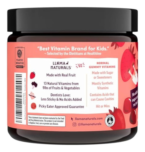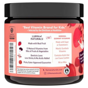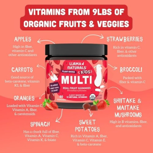 Llama Naturals – Vitaminas de goma de frutas reais para crianças, sem adição de cana-de-açúcar, beta-carotenos, multivitamínico integral, mastigável, contagem de 90 (30-45 dias), morango